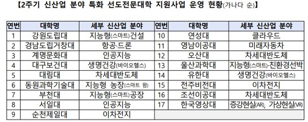 ‘신산업 분야 특화 선도전문대학 지원사업’은 디지털 전환 등 산업 변화에 따른 신산업 인력 부족에 대응하고 전문대학이 현장 직무역량을 갖춘 전문기술인재 양성에 선도적 역할을 수행할 수 있도록 지원하는 사업이다, 2021년부터 추진되어 ‘학과 개편 현장맞춤형 교육과정 개발·운영, 학사운영 유연화’ 등을 통해 신산업 분야 실무형 인재 양성을 지원하고 있다. 2024년부터 시작한 2주기 사업(2024~2026)에서는 다양한 신산업 인재양성을 위해 지원분야를 확대하였으며, 총 17개 전문대학에 142억 원을 지원하고 있다.
