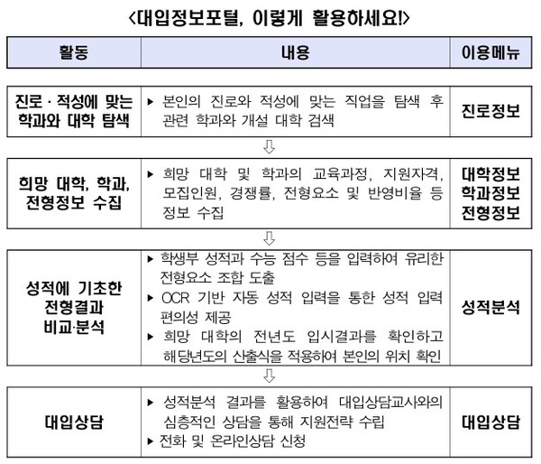한편, 대교협 공식 유튜브 채널 ‘대학어디가TV’에서는 대입정보포털 어디가 홈페이지를 활용한 진로 및 직업정보 탐색방법, 대학별 성적 분석방법, 대입지원 시 유의사항 등을 상세히 안내하고 있다.