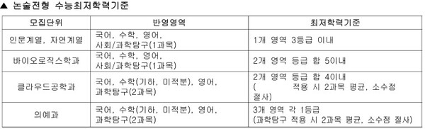 논술전형의 수능최저학력기준은 1개 영역 3등급 이내이다. 하지만 바이오로직스학과는 2개 영역 등급합 5이내, 클라우드공학과는 2개 영역 등급합 4 이내, 의예과는 3개 영역 각 1등급으로 기준이 다르다.