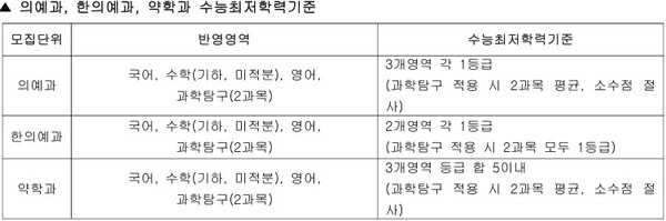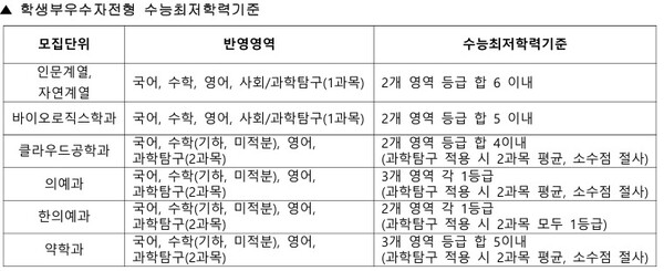 학생부종합전형의 인문계열, 자연계열 모집단위는 수능최저학력기준이 없으며 의예과, 한의예과, 약학과에 한하여 수능최저학력기준을 적용한다.