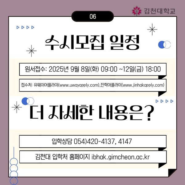 최은진 기자 news@dhinsight.co.kr 전체 < 기사목록 - SNS 기사보내기 페이스북(으)로 기사보내기 트위터(으)로 기사보내기 네이버블로그(으)로 기사보내기 URL복사(으)로 기사보내기 기사스크랩하기 다른 공유 찾기 현재위치 [수시모집] 입력 2025.08.31 12:07 댓글 0 인쇄 본문 글씨 키우기 가 본문 글씨 줄이기