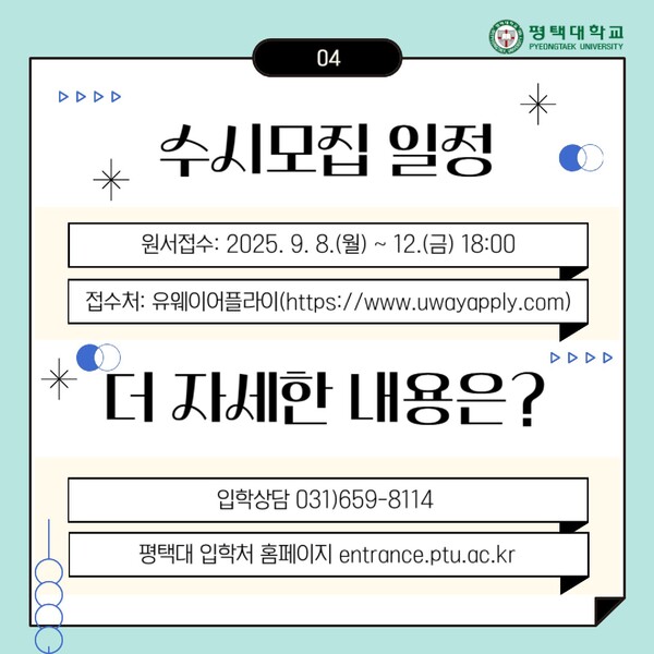 이영선 기자 news@dhinsight.co.kr 전체 < 기사목록 - SNS 기사보내기 페이스북(으)로 기사보내기 트위터(으)로 기사보내기 네이버블로그(으)로 기사보내기 URL복사(으)로 기사보내기 기사스크랩하기 다른 공유 찾기 현재위치 [수시모집] 입력 2025.09.02 12:21 댓글 0 인쇄 본문 글씨 키우기 가 본문 글씨 줄이기