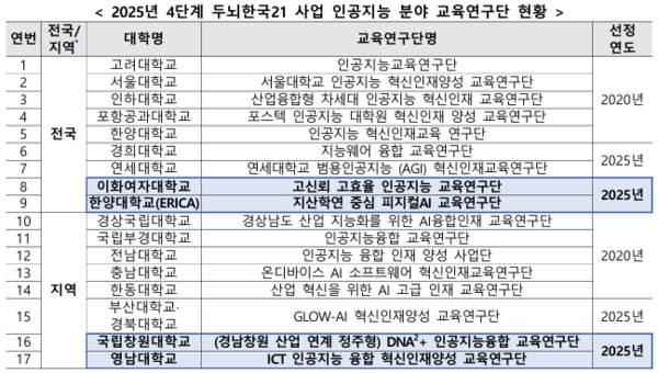 이화여대 ‘고신뢰 고효율 인공지능 교육연구단’, 한양대(ERICA) ‘지산학연 중심 피지컬 인공지능(AI) 교육연구단’, 국립창원대 ‘디엔에이2(DNA2)+인공지능융합 교육연구단’, 영남대 ‘아이시티(ICT) 인공지능 융합 혁신인재양성 교육연구단’이 4단계 두뇌한국21 혁신인재 양성사업의 인공지능 분야에 추가로 예비 선정됐다.