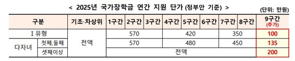 2025학년도에는 지원 기준이 기존의 8구간 이하에서 9구간 이하로 확대되어 지원 대상이 약 100만 명에서 150만 명으로 대폭 확대된다. 신규 지원 대상인 9구간에 속하는 학생은 국가장학금 Ⅰ유형(소득과 연계해 차등지원)의 경우 연간 100만 원을 지원받을 수 있으며, 다자녀의 경우 첫째·둘째는 연간 135만 원, 셋째 이상은 연간 200만 원을 지원받을 수 있다.